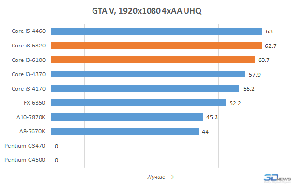 Что же касается Pentium, то с ними всё не так просто. Их производительность в сравнении с Core i3 заметно ниже, даже если речь идёт о LGA1151-новинках. К тому же из-за того, что они не поддерживают Hyper-Threading и не способны исполнять четыре вычислительных потока одновременно, ряд современных игр может иметь с ними проблемы. Такие ситуации уже наблюдались в прошлом, их мы видим и сейчас, например в GTA V, где отрисовка сцен при использовании Pentium выполняется с ошибками (и именно поэтому результат Pentium в этой игре мы не приводим).