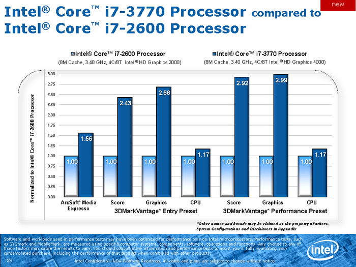 В пакете ArcSoft MediaConverter 7 новый процессор показал 56% преимущество над своим предшественником при перекодировании 10-минутного HD-видео. Тестирование в пакте 3DMark Vantage показало общее превосходство на уровне от 2,5 до 3 раз — большая часть заслуги, конечно, принадлежит IGP, но и CPU обошёл Sandy Bridge на 17%. Стоит отметить, что графическое ядро HD 4000 имеет на 200 МГц более низкую частоту в сравнении с HD 2000, даже в режиме Turbo.