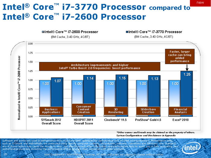Другие тесты, проведённые в пакетах SYSmark 2012, HDXPRT 2011, Cinebench 11.5, ProShow Gold 4.5 и Excel 2010, показывают, что внесённые в Ivy Bridge архитектурные изменения, а также более высокие частоты благодаря Intel Turbo Boost 2.0 обеспечивают рост производительности от 7% до 15%. Excel же смог задействовать более быструю кеш-память Core i7-3770, благодаря чему превосходство составило 25%. Тестирование Core i5 в сравнении с аналогичным процессором текущего поколения показывает примерно тот же уровень прироста вычислительной мощности.